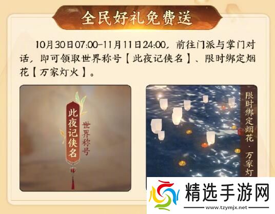 3、10月30日7:00至11月1日24:00,前往门派与掌门对话的玩家即可获得【此夜记侠名】的世界地图,同时还可以获得绑定烟花【玩家灯火】的奖励。