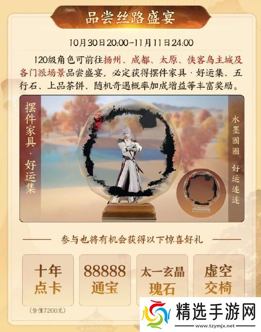 2、参与交互盛宴的玩家即可获得摆件家具、五行石、上品茶饼以及随机奇遇概率加成增益等奖励;